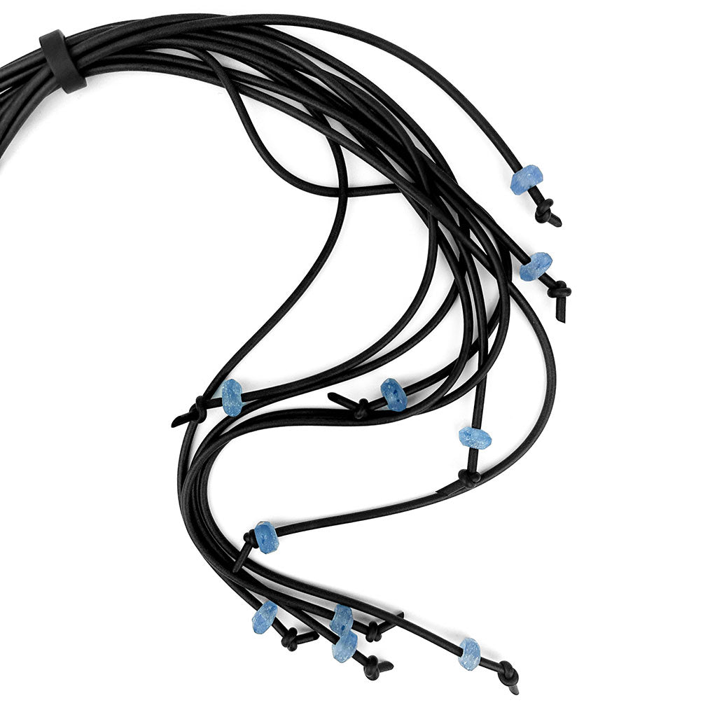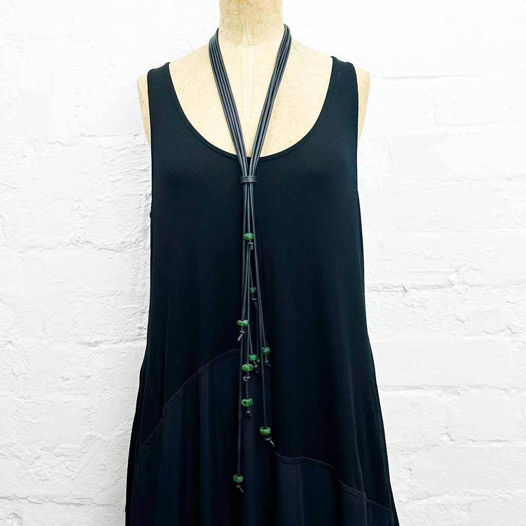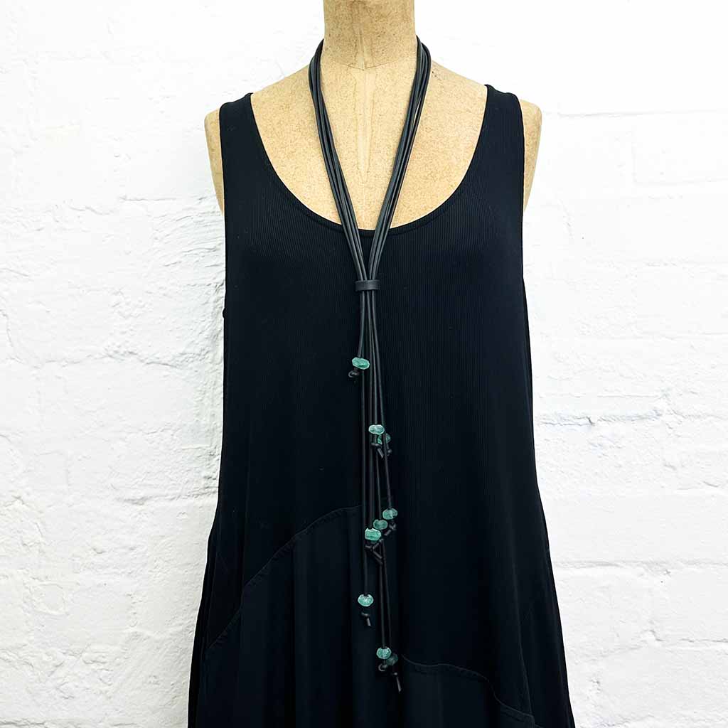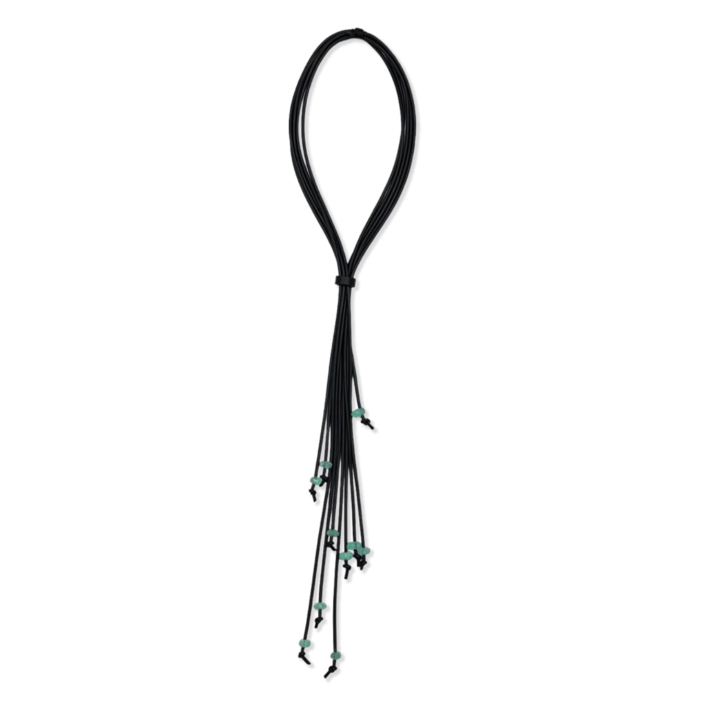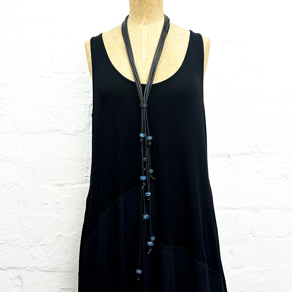 The beads are threaded on strands of black soft rubber  which means the necklace is soft and comfortable to wear. It is finished with a rubber toggle which can be moved up or down the strands to alter the look a little.