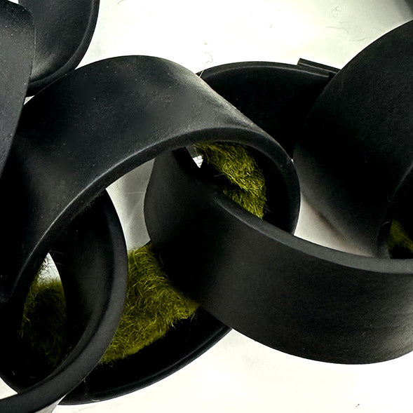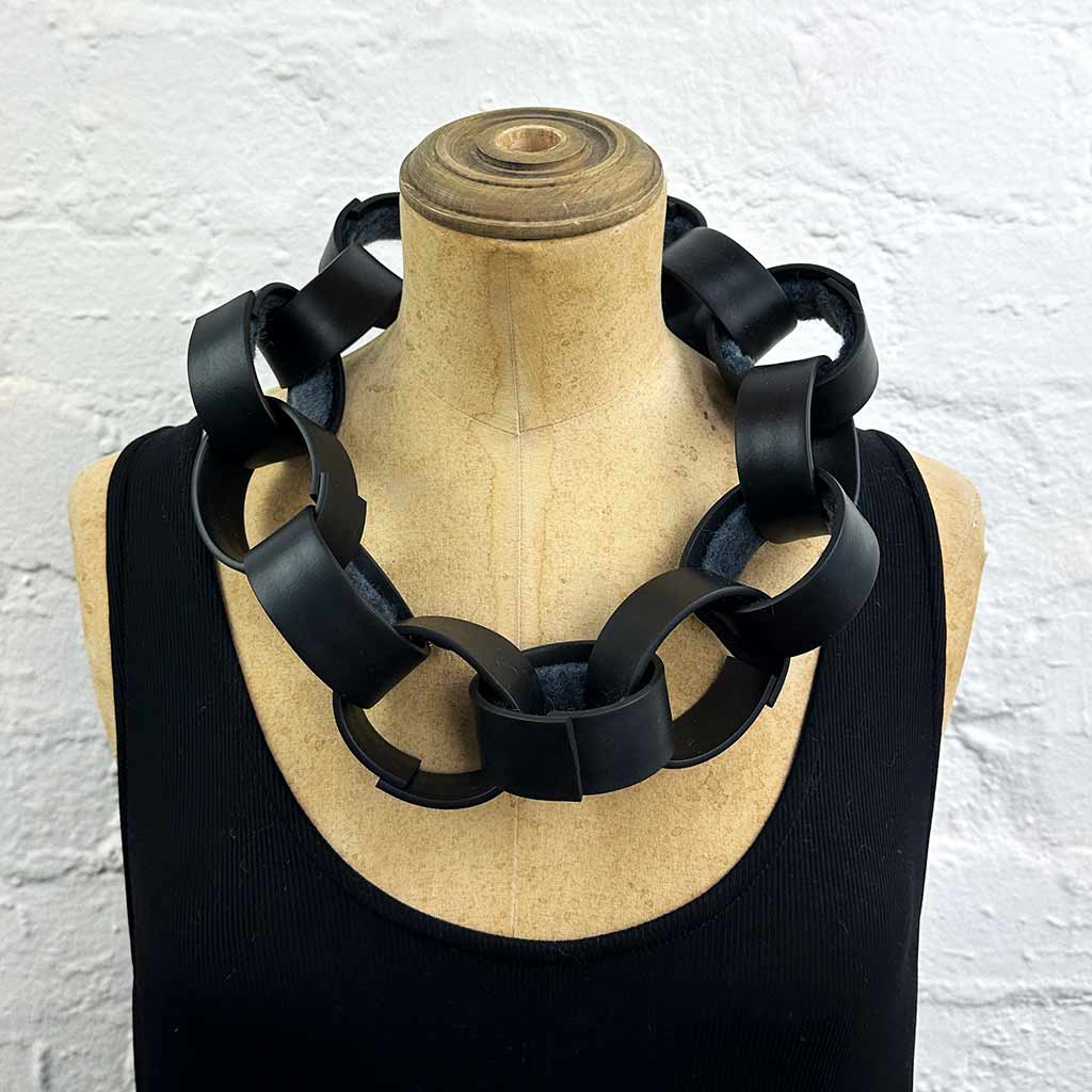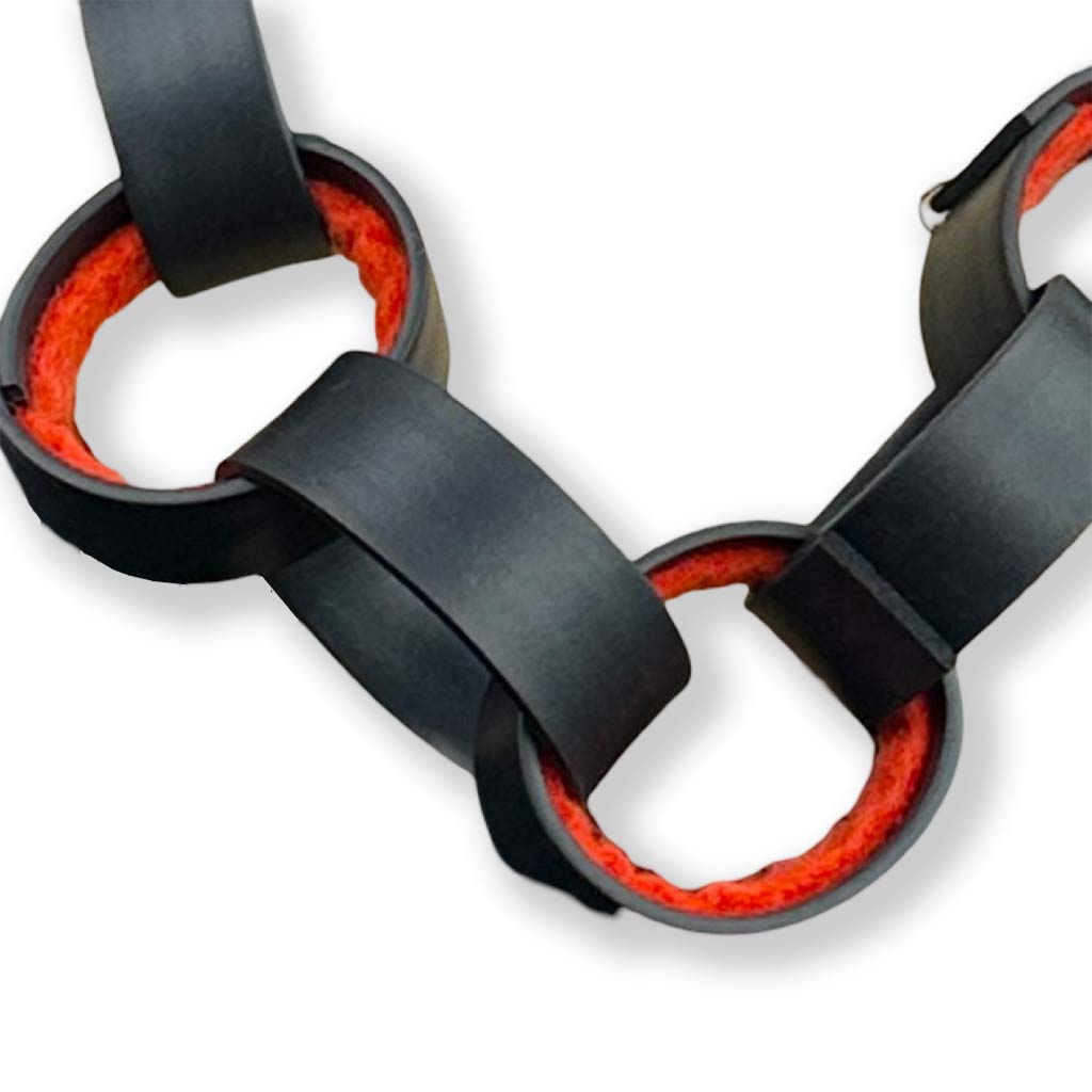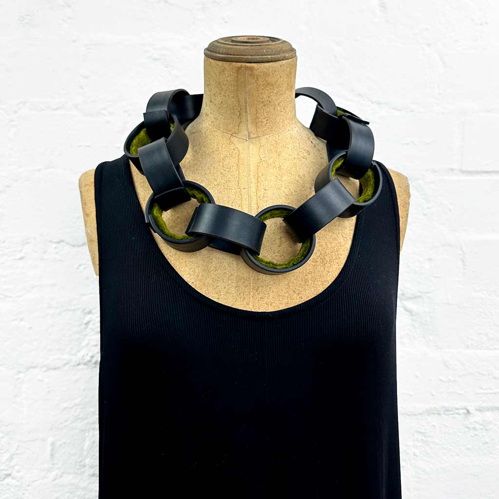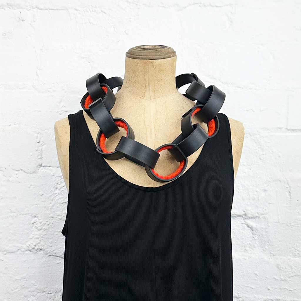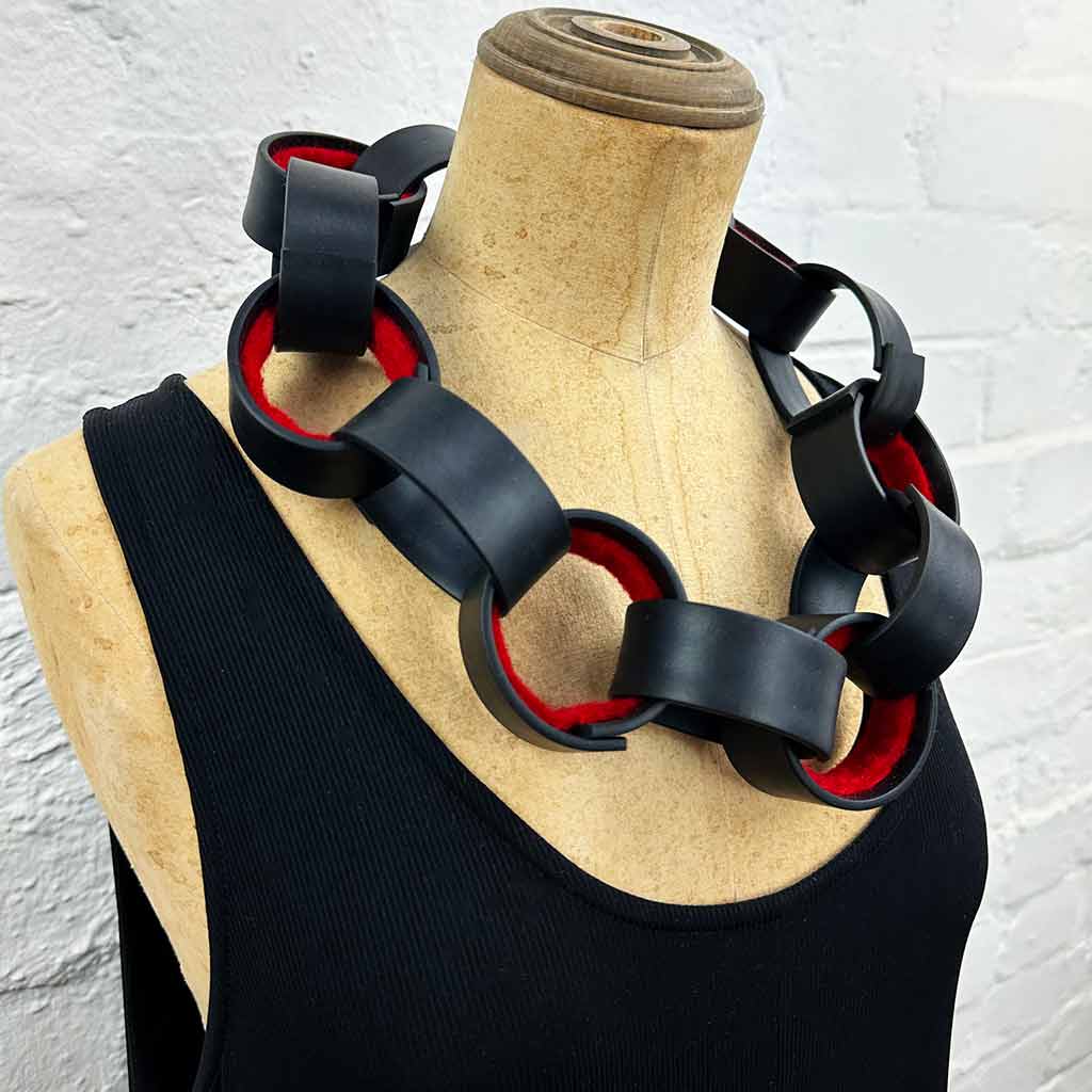 Rubber link chain with fascinating internal features of felt. These elements come together to form a dramatic short necklace with highlights of of bold colour and texture.