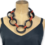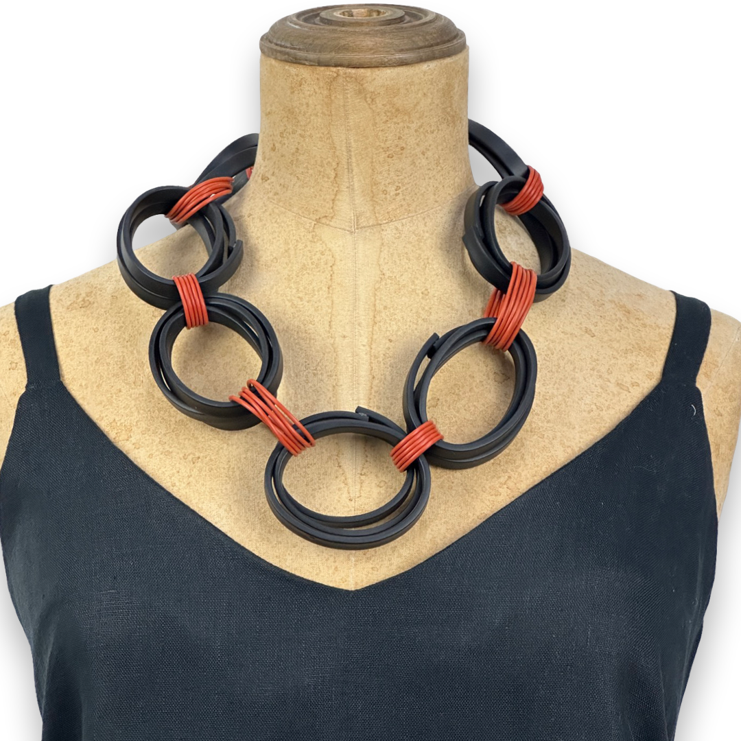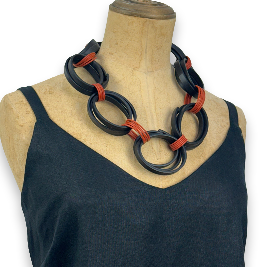 Strips of black rubber link chain with tan, fine rubber o-ring links. These elements come together to form a dramatic short necklace with highlights of of bold colour and texture.