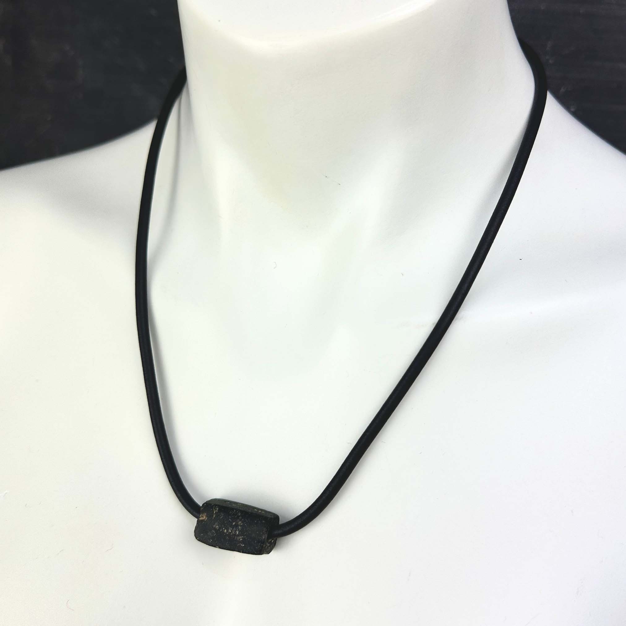Interesting, industrial looking black stone bead with rough flecks. This necklace features slightly thinner rubber cord, and is slightly longer than the chunkier version using the same style bead.
