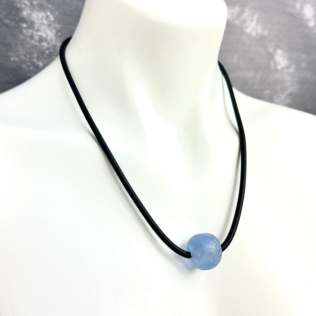 short single bead and thin rubber necklace -blue frosted sea glass
