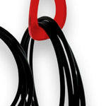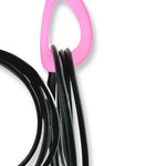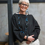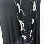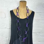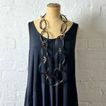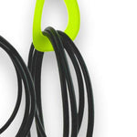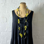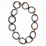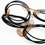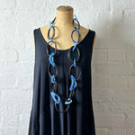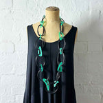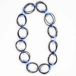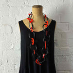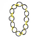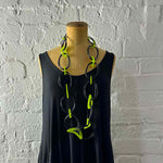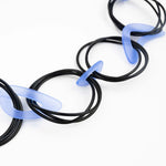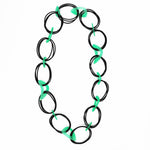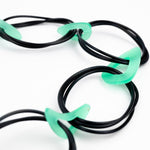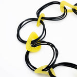 Light and gently colourful while still deferring to black this necklace comes in a wide range of colours, cut into fabulous organic shapes that link together O-rings which have been upcycled from disused industrial waste.