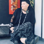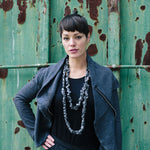 I bought the narrower version of this recently in black ( I already have the large Chaotic round rubber necklace in olive) I just love Rowans modern and standout jewellery. I wore my new addition yesterday with a black t shirt and jeans. It made me feel chic and up to date, even at 70! It also feels 'right' as I'm a shortie at just 5' tall. I have several of these necklaces now and love how they are light and fun to wear. I paired it with a pair of Rowans' black disc drop earrings. Rowan packages her items really well and they arrive very quickly. I am very happy to support this small one woman business.