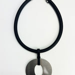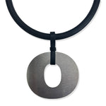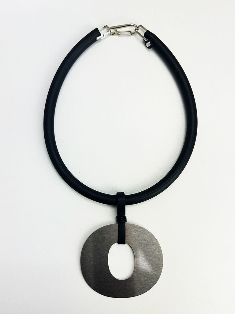 The brushed stainless steel "O" is suspended from a chunky rubber neckpiece, finished with a metal clasp