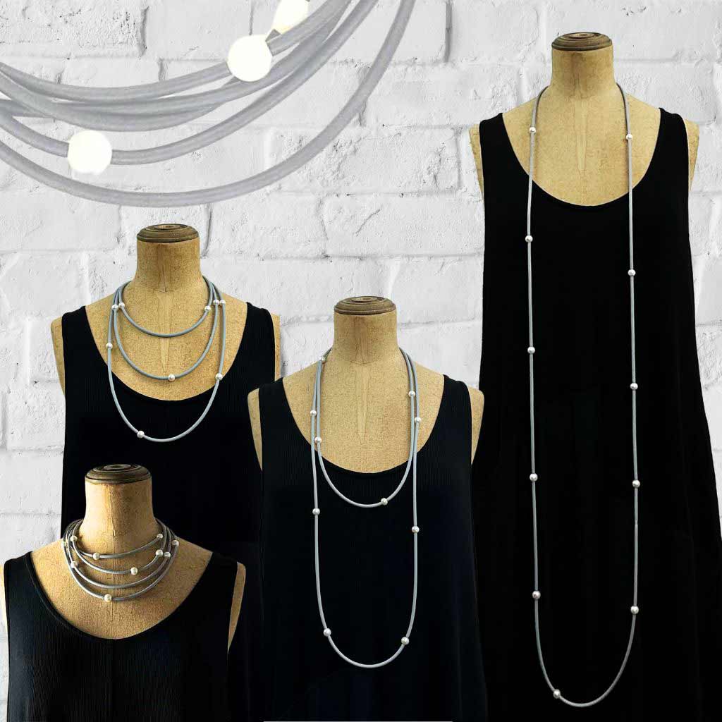 Dayle is wearing 2 of the black rubber and pearl necklaces.