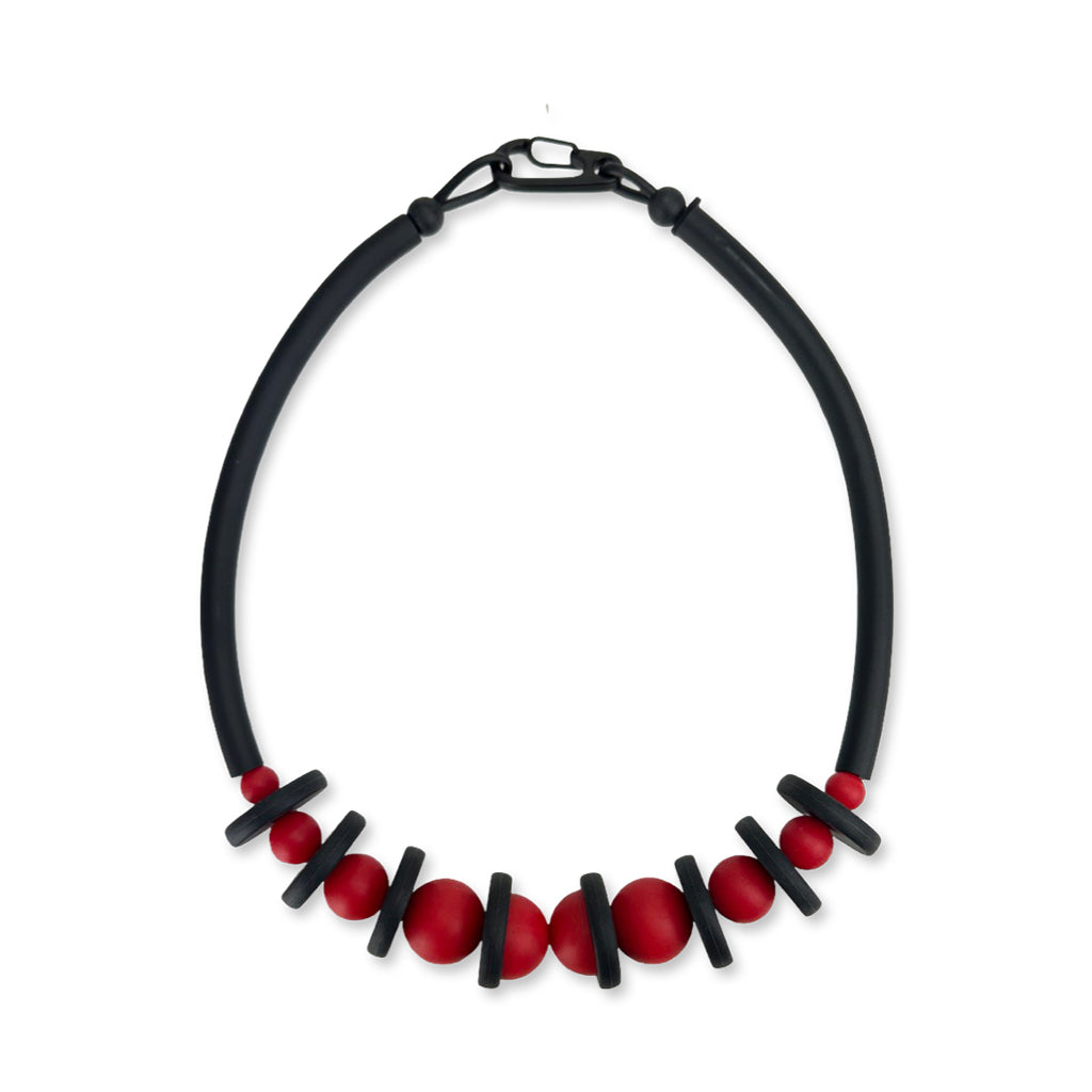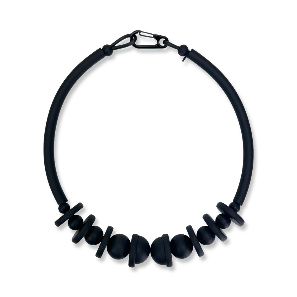 This striking rubber necklace is a conversation starter in the best possible way.