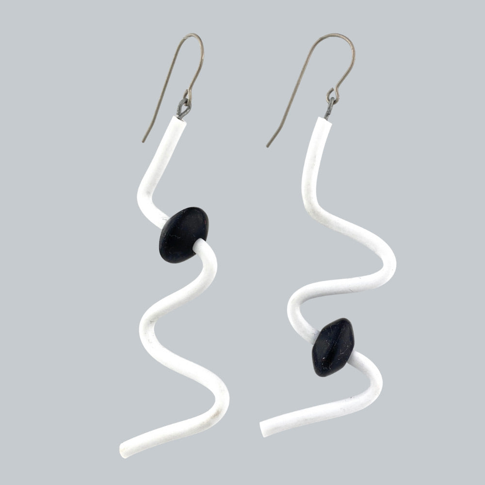 Rubber and wire squiggle earrings on titanium ear wires.