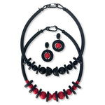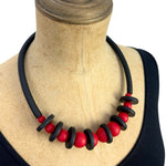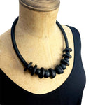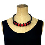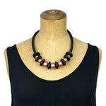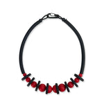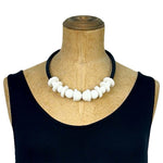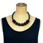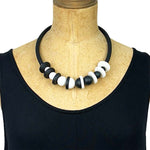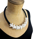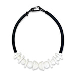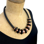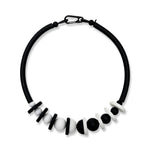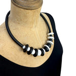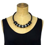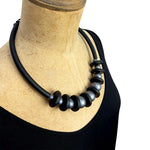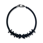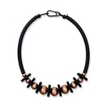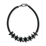 With graduated rubber beads, separated by rubber discs, it brings texture, and just the right amount of drama.