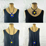 I'm a sucker for anything flower related, so couldn't resist this necklace. I purchased the blue/yellow/black combo. I like that it's reversible and that I can adjust the length. Adjusting the necklace is really easy and I will adjust it to whatever suits best to what I'm wearing at the time.