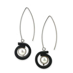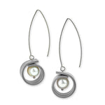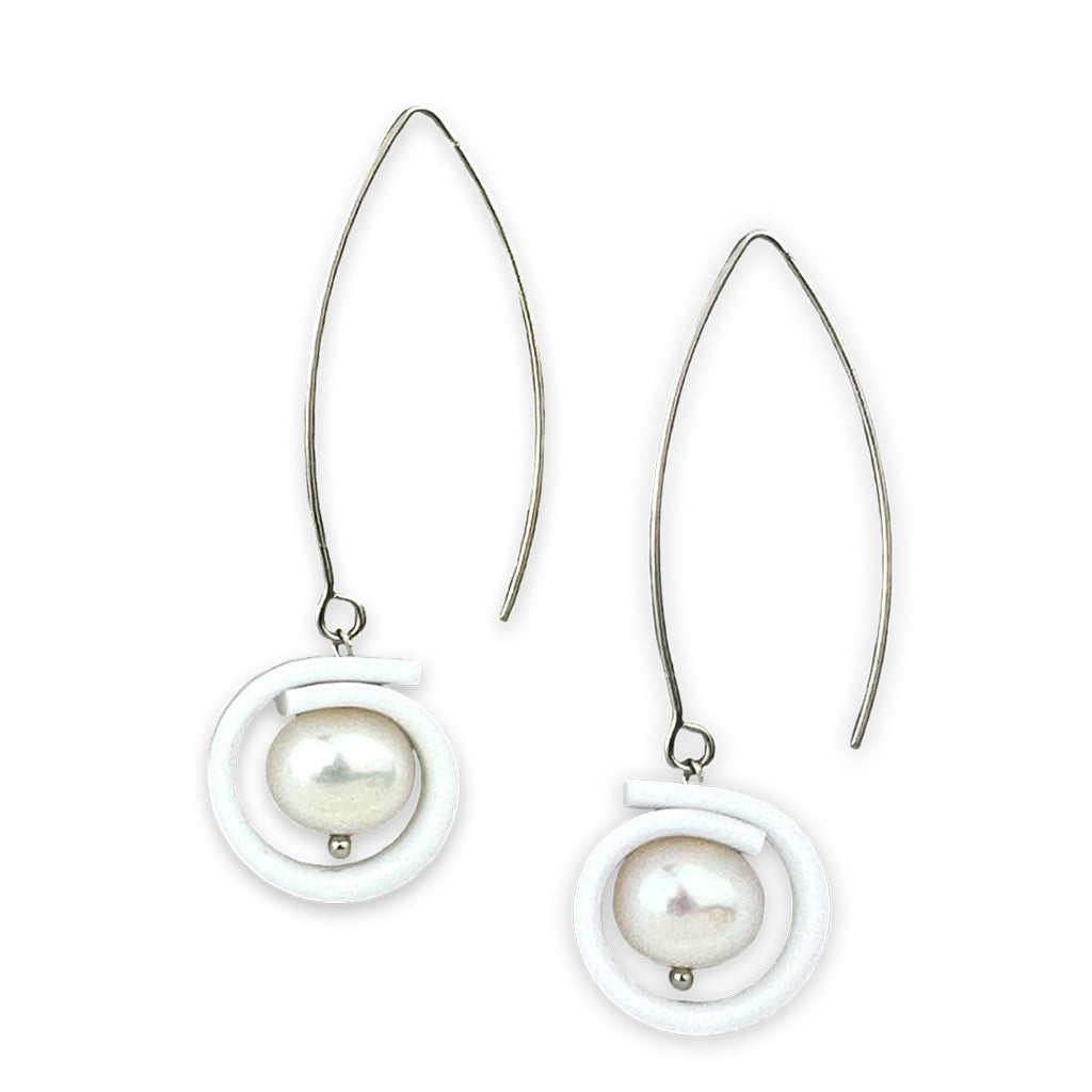 Freshwater pearls wrapped in a strip of rubber hanging from slender stainless steel marquise shaped, ear wires.