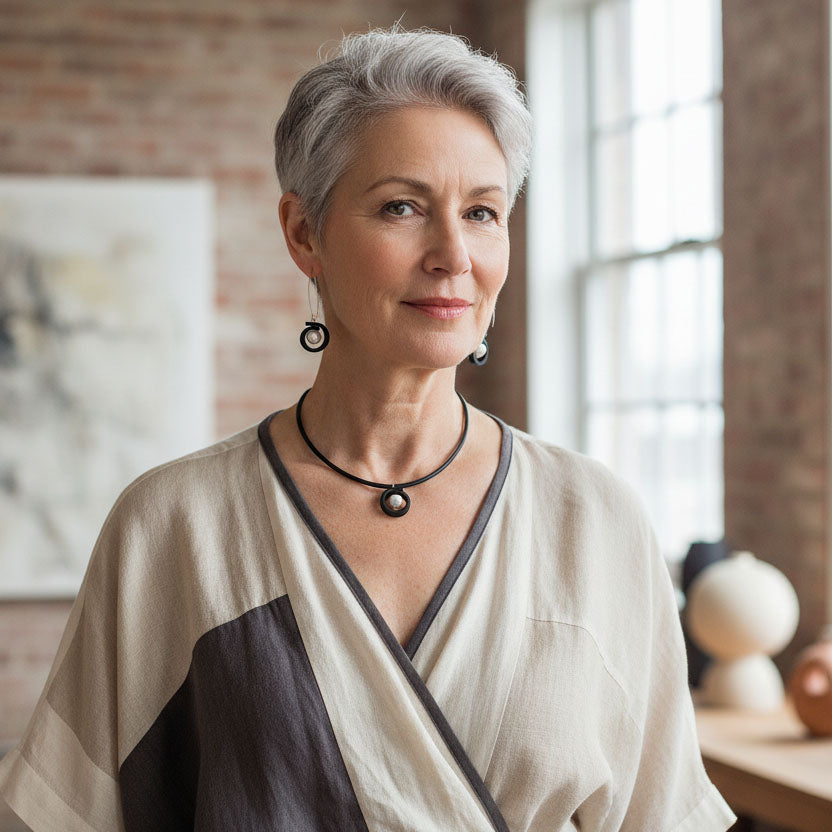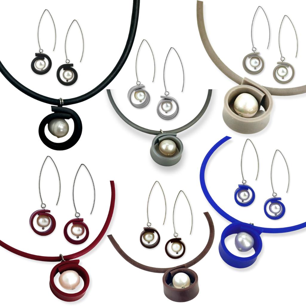 Looking for something to pair with the earrings? The obvious choice is the SINGLE PEARL NECKLACE however, they also look fabulous with Tangled strips of rubber necklace and the Sketch Necklaces